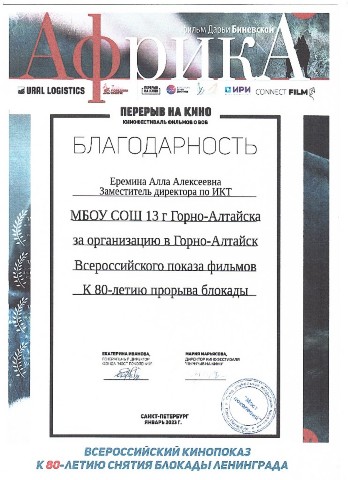 Благодарность за организацию Всероссийского показа фильмов к 78-й годовщине снятия блокады, январь 2022 |