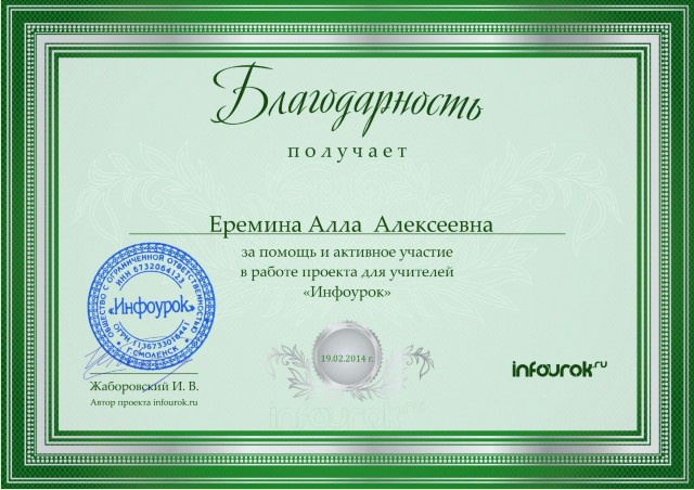 Благодарность за помощь и активное участие в работе проекта для учителей Инфоурок, 2014г |