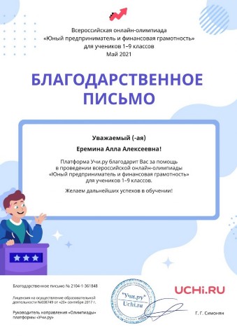 Благодарственное письмо платформы Учи.ру за помощь в проведении всероссийской онлайн-олимпиады «Юный предприниматель и финансовая грамотность» для 1-9 классов, май 2021 |
